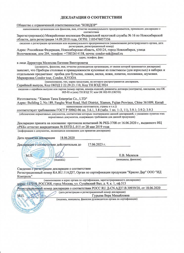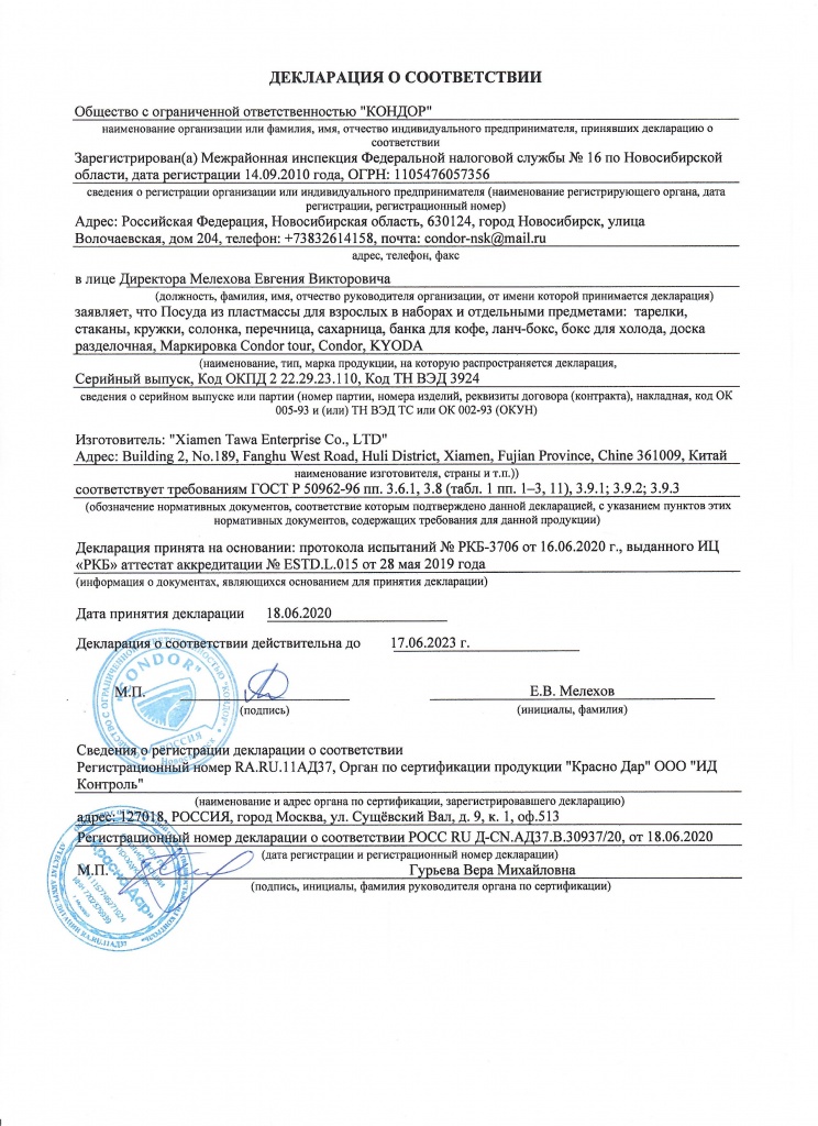ДЕКЛАРАЦИЯ НА ПРИБОРЫ СТОЛОВЫЕ ПЛАСТМАССОВЫЕ ИЗ НАБОРОВ ДЛЯ ПИКНИКА ДО 17.06.2023 Скачать |