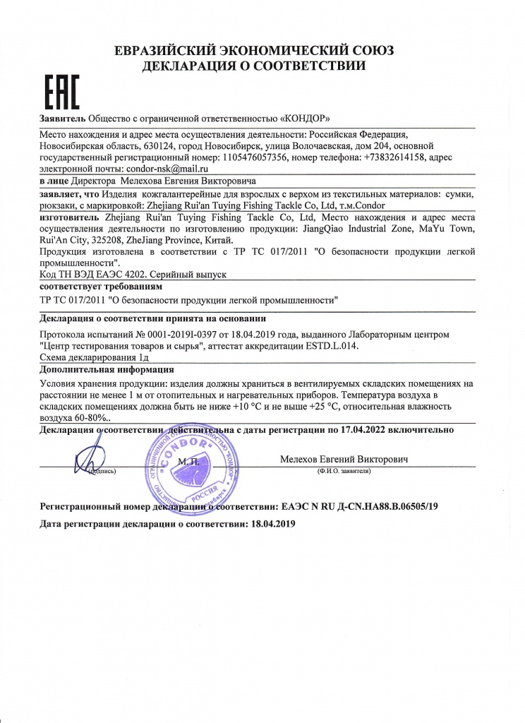 ДЕКЛАРАЦИЯ НА РЮКЗАКИ И ЧЕХЛЫ ДЛЯ УДОЧЕК ДО 18.04.2022 Cкачать |