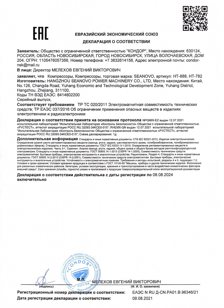 ДЕКЛАРАЦИЯ НА КОМПРЕССОРЫ НТ-888, НТ-782 |